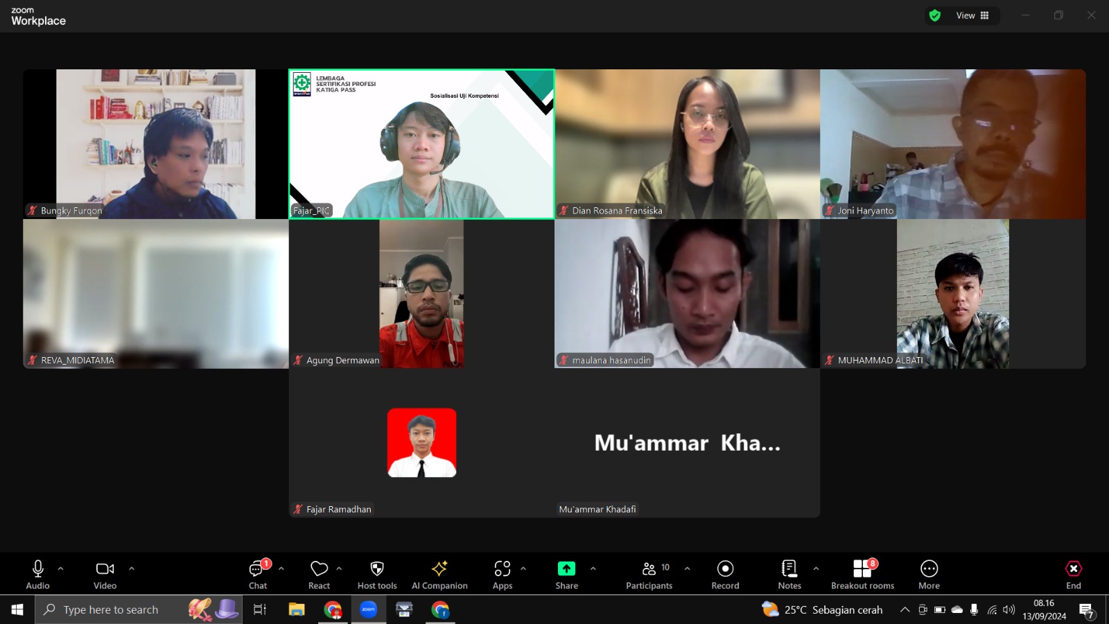 Pembukaan Uji Kompetensi melalui Zoom Ahli K3 BNSP yang dilaksanakan pada tanggal 13 Sept 2024 yang di uji oleh Asesor Kompetensi, bertempat di TUK Midiatama Academy, Jakarta Barat